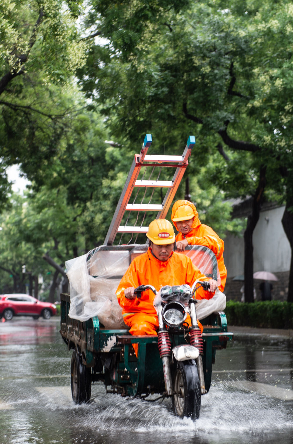 7月12日,两名工人在北京鼓楼西大街冒雨骑行。