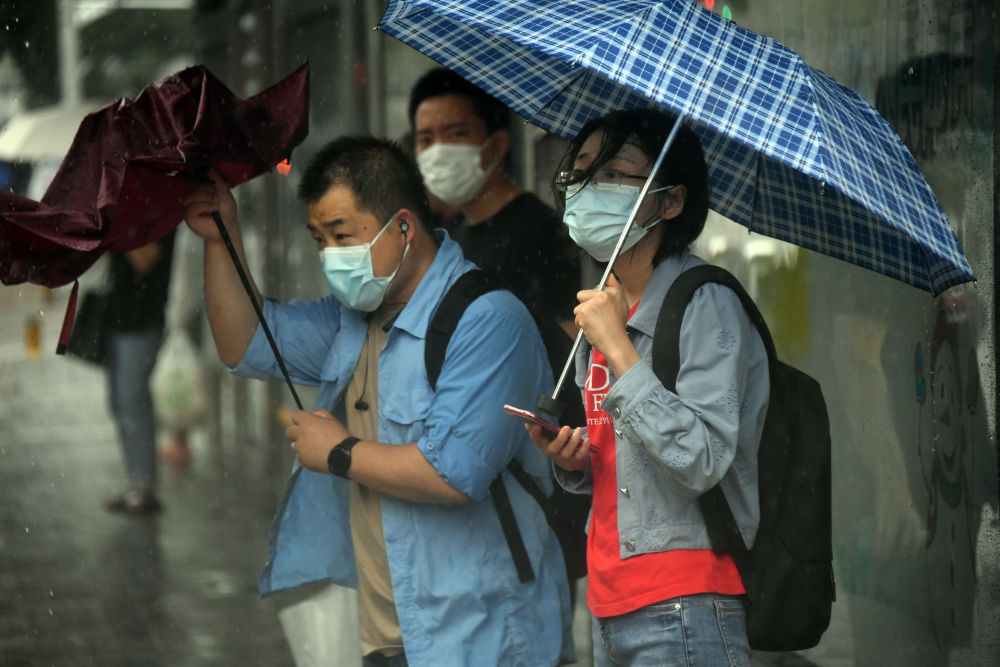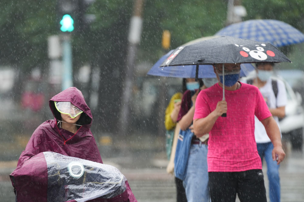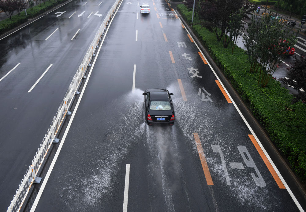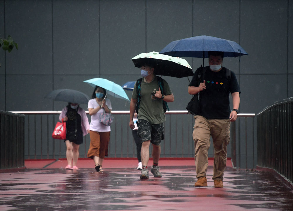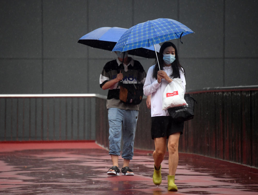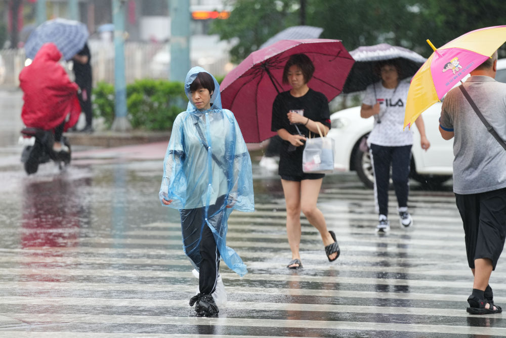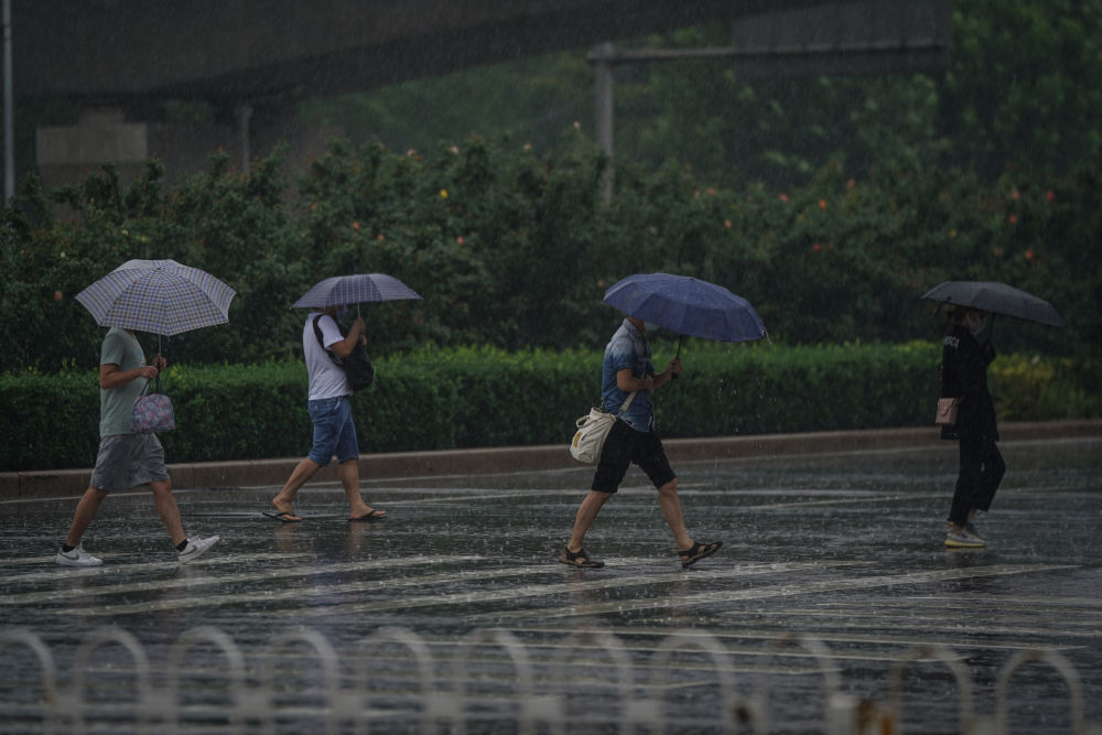 7月12日,行人在北京市朝阳区姚家园路冒雨前行。
