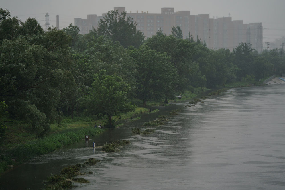 7月12日,在北京市大兴区亦庄镇凉水河畔,河水漫上河两侧的步道。