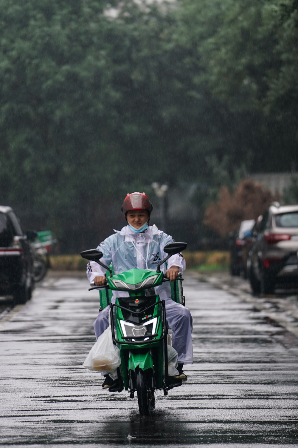 7月12日,在北京市大兴区亦庄镇,一名快递员在雨中送货。