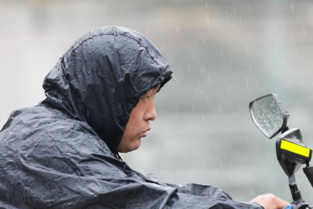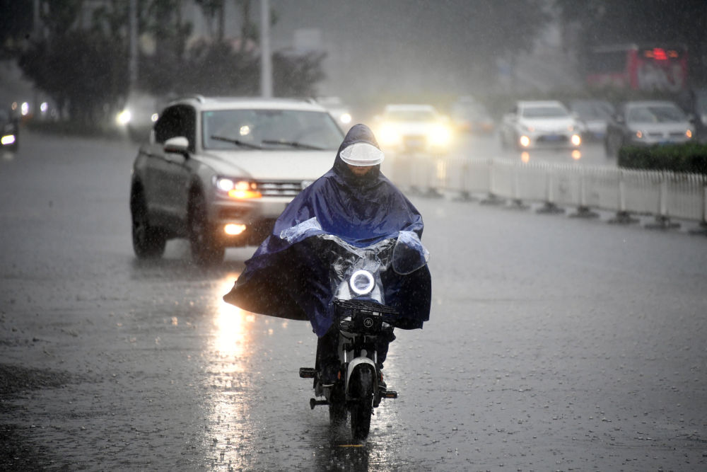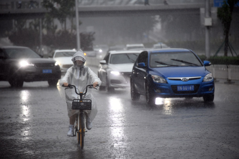 7月12日, 在北京市海淀区中关村街道科学院南路,市民在雨中骑行。