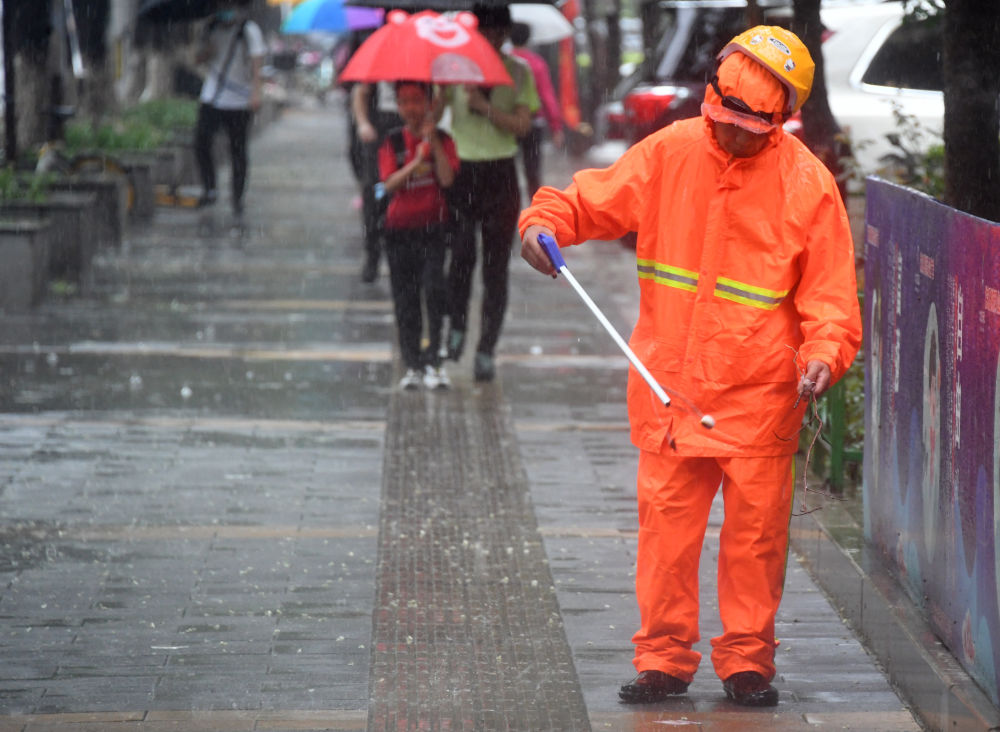 7月12日, 在北京市海淀区中关村街道科学院南路步道上,环卫工人在雨中作业。