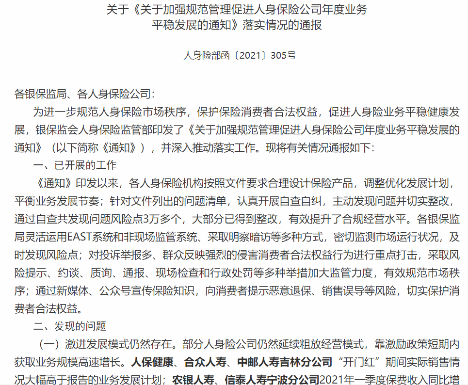 银保监会日前通报人身保险公司业务发展中出现的主要问题,表现为:激进发展模式仍然存在,风险防控机制不健全,市场乱象仍然多发。泰康人寿等多家保险公司被点名批评。