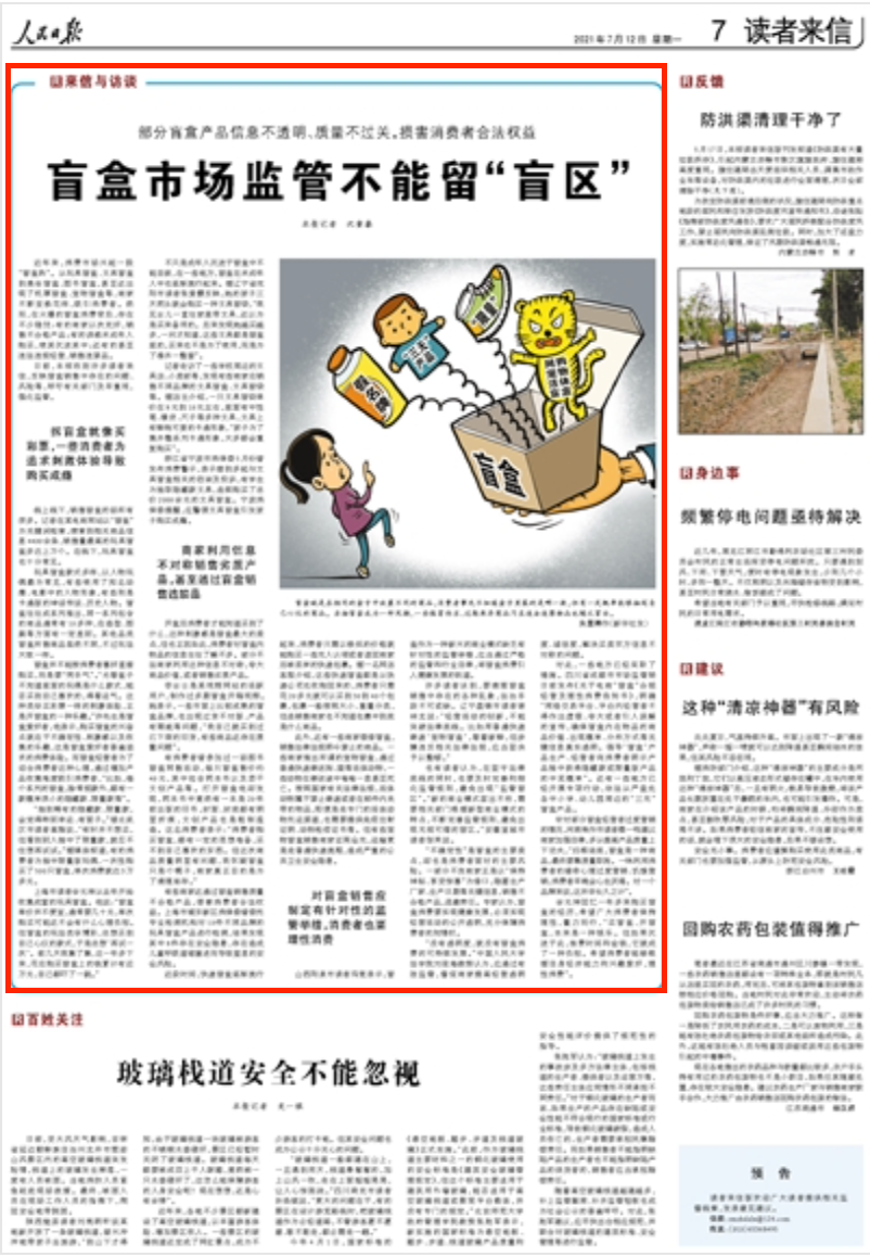 日前,本报收到许多读者来信,反映盲盒销售中存在的问题、风险等,呼吁有关部门及早重视,强化监管。