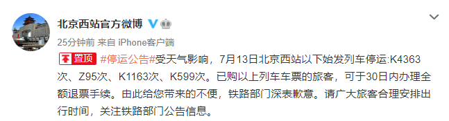 据北京西站官方微博消息,受天气影响,7月13日北京西站以下始发列车停运:K4363次、Z95次、K1163次、K599次。已购以上列车车票的旅客,可于30日内办理全额退票手续。由此带来的不便,铁路部门深表歉意。请广大旅客合理安排出行时间,关注铁路部门公告信息。