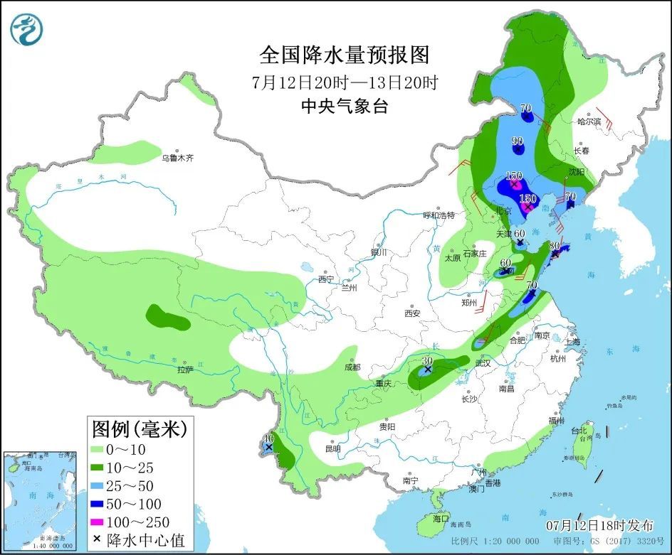 12日20时至13日20时,河北东北部、内蒙古东部、辽宁西部和南部以及山东半岛南部、江苏北部等地的部分地区有大到暴雨,其中,河北东北部、内蒙古东南部等地局部地区有大暴雨。