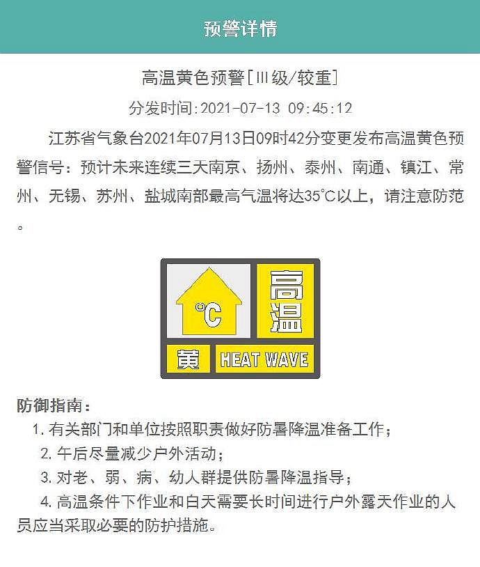 江苏省气象台7月13日9时42分变更发布高温黄色预警信号:预计未来连续三天南京、扬州、泰州、南通、镇江、常州、无锡、苏州、盐城南部最高气温将达35℃以上,请注意防范。(总台央视记者 吴睿)