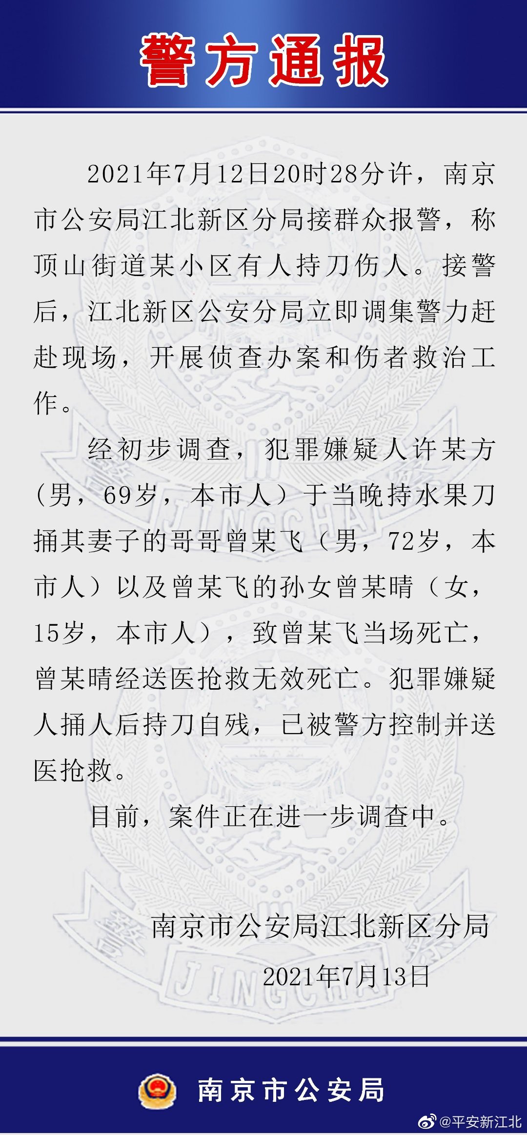 经初步调查,犯罪嫌疑人许某方(男,69岁,南京市人)于当晚持水果刀捅其妻子的哥哥曾某飞(男,72岁,南京市人)以及曾某飞的孙女曾某晴(女,15岁,南京市人),致曾某飞当场死亡,曾某晴经送医抢救无效死亡。犯罪嫌疑人捅人后持刀自残,已被警方控制并送医抢救。
