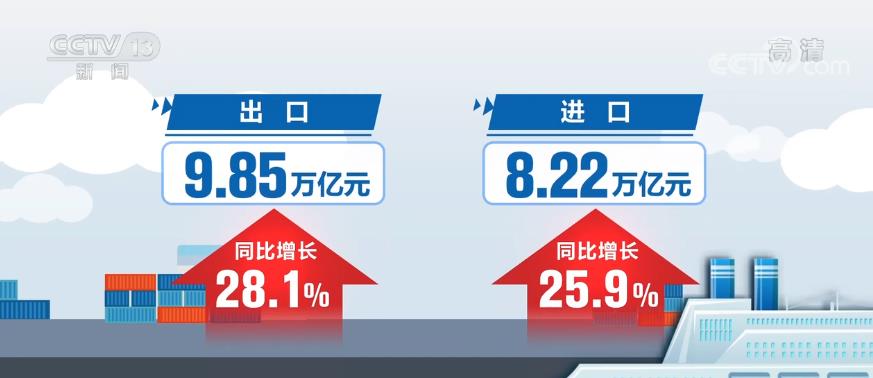 据海关统计,今年上半年,我国外贸进出口总值18.07万亿元,同比增长27.1%。其中出口9.85万亿元,同比增长28.1%;进口8.22万亿元,同比增长25.9%。