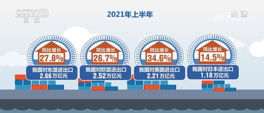 上半年我国对东盟、欧盟、美国、日本分别进出口2.66万亿元、2.52万亿元、2.21万亿元和1.18万亿元,同比分别增长27.8%、26.7%、34.6%和14.5%。东盟为我国第一大贸易伙伴,占我国外贸总值的14.7%。