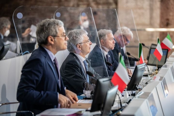 7月9日,二十国集团轮值主席国意大利经济和财政部长达尼埃莱·佛朗哥(左二)在威尼斯出席二十国集团财政部长和中央银行行长会议。新华社发(G20意大利供图)