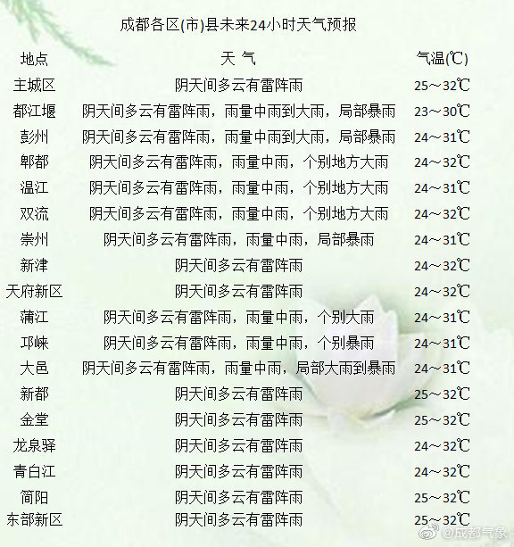 今天白天蓉城为晴热模式,最高气温出现在简阳为35.8℃,未来三天是多雨时段,且降雨量较大;预计今天晚上到明天阴天间多云有雷阵雨,西部局部地方暴雨,雷雨时伴有短时阵性大风,气温23~32℃;