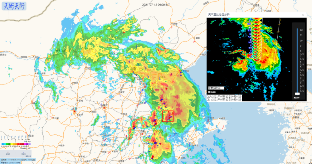 中国气象局综合气象观测产品系统(天衡天衍)密切关注了此次北方强降水天气过程。12日9时雷达回波叠加850hpa风场和雷电监测产品显示,河北、天津、山东一带由低涡引起的大范围降水回波强度仍较强。