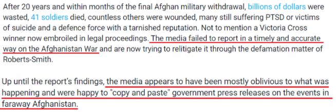 澳政论杂志《独立澳大利亚》指出,澳媒长期未能准确报道阿富汗战争,而是习惯于“复制粘贴”政府的新闻稿。因此,从澳大利亚最初选择追随美国入侵阿富汗,到现在澳军人犯下的战争罪行被曝光,澳媒“正义的声音”都缺席了。
