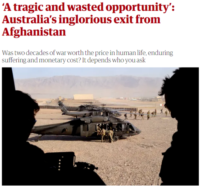 英国《卫报》以《澳大利亚不光彩地撤出阿富汗》为题发文指出,在追随美国入侵阿富汗的20年里,澳大利亚陷入了一场无法打赢的战争。“为这场历时20年的战争付出生命、痛苦和金钱的代价值得吗?这取决于你问谁”。