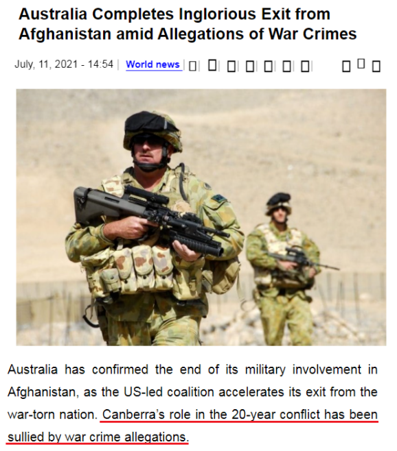 伊朗塔斯尼姆通讯社评论称,虽然澳军离开了阿富汗,但澳大利亚政府在这场长达20年的战争中所扮演的角色已被战争罪指控所玷污。
