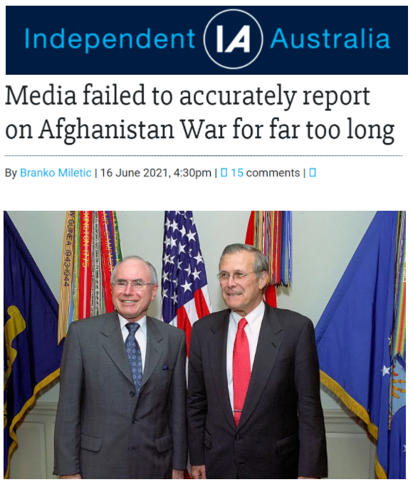 △《独立澳大利亚》(IndependentAustralia)报道截图(题图为阿富汗战争开始时的澳总理霍华德和美国防部长拉姆斯菲尔德)