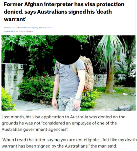 一名曾受雇于澳军的前阿富汗口译员上月被澳方拒绝提供保护性签证,理由是他没有直接受雇于澳政府。该男子告诉澳媒,由于和澳军合作的经历,他经常面临死亡威胁。被拒签后,“我感觉澳大利亚已经签署了我的死刑执行令”。