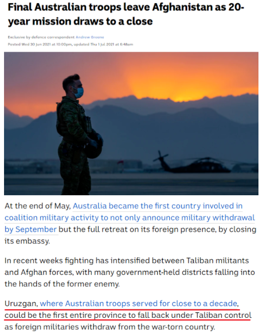 作为美国的铁杆盟友,澳大利亚在美国发动“反恐”战争后的第一时间就派兵到了阿富汗。20年来,澳大利亚领导人一直都在说“不会抛弃阿富汗”,但现在的事实却正好相反。