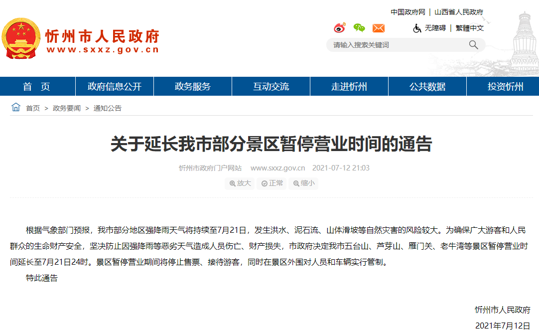 记者从山西忻州市政府了解到,根据气象部门预报,忻州市部分地区强降雨天气将持续至7月21日,发生洪水、泥石流、山体滑坡等自然灾害的风险较大。为确保广大游客和人民群众的生命财产安全,防止因强降雨等恶劣天气造成人员伤亡、财产损失,忻州市政府决定忻州市五台山、芦芽山、雁门关、老牛湾等景区暂停营业时间延长至7月21日24时。景区暂停营业期间将停止售票、接待游客,同时在景区外围对人员和车辆实行管制。