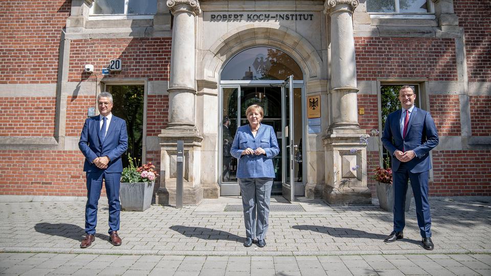 △(从左至右)威勒、默克尔和施潘在罗伯特·科赫研究所前(图片来源:路透社)