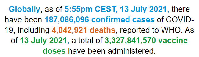 根据世卫组织最新实时统计数据,截至欧洲中部夏令时间7月13日17时55分(北京时间7月13日23时55分),全球累计新冠肺炎确诊病例187086096例,累计死亡病例4042921例。13日全球新冠肺炎确诊病例新增372970例,死亡病例新增7469例。(总台记者 朱赫)