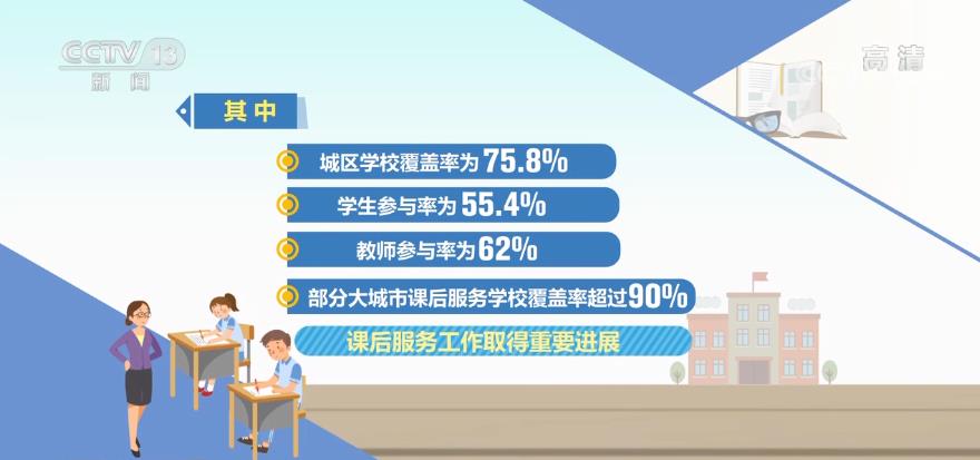 其中,城区学校覆盖率为75.8%,学生参与率为55.4%,教师参与率为62%,部分大城市课后服务学校覆盖率超过90%,课后服务工作取得重要进展。