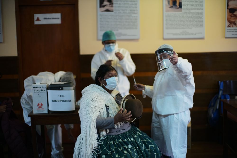 7月5日,在玻利维亚行政首都拉巴斯一处临时疫苗接种点,一名印第安人接种中国国药新冠疫苗。新华社记者赵凯摄