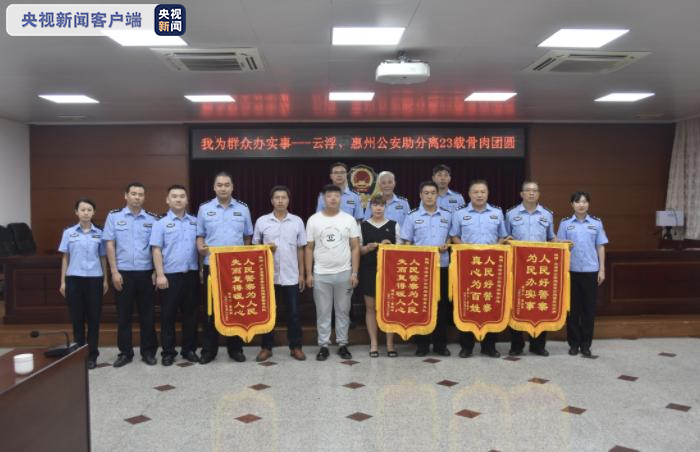 5月26日,秦先生夫妇在云浮市云安分局与失散23年的儿子重聚。一家人喜极而泣,用颤抖的双手相互紧紧拥抱,低声诉说着对对方的思念。秦先生夫妇特意带来了锦旗,亲手送给惠州、云浮两地警方,表达内心深深的感谢。