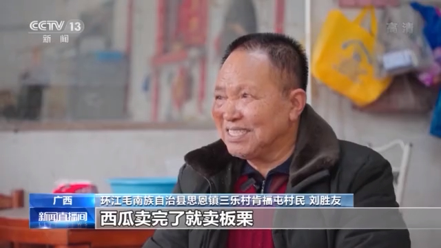 环江毛南族自治县思恩镇三乐村肯福屯村民 刘胜友:蔬菜卖完了又卖豆,豆卖完了又是卖西瓜,西瓜卖完了就卖板栗,板栗卖完了就卖水果,所以说是一年四季都有收入。