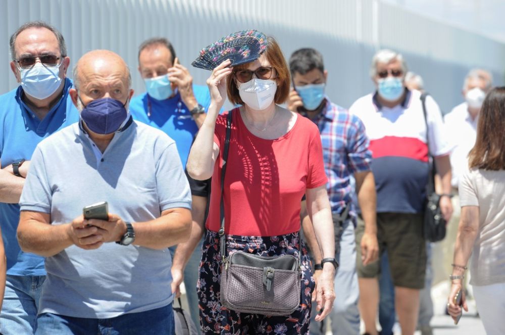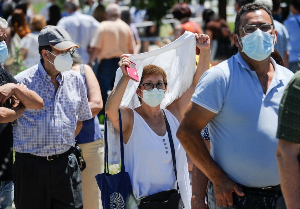 7月7日,市民在西班牙首都马德里的伊莎贝尔·森达尔医院外冒着烈日排队等候接种新冠疫苗。(新华社发,古斯塔沃·巴连特摄)