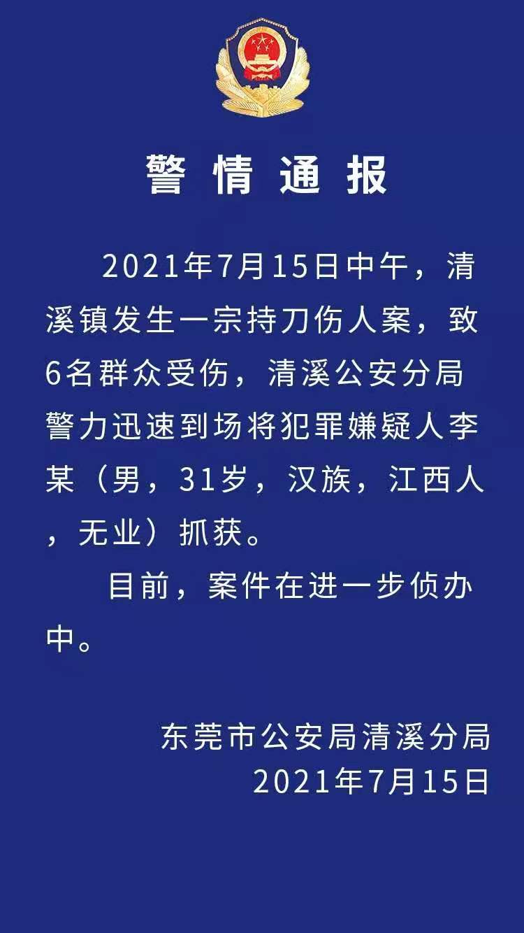 广东东莞市公安局清溪分局通报,2021年7月15日中午,东莞市清溪镇发生一宗持刀伤人案,致6名群众受伤,清溪公安分局警力迅速到场将犯罪嫌疑人李某(男,31岁,汉族,江西人,无业)抓获。