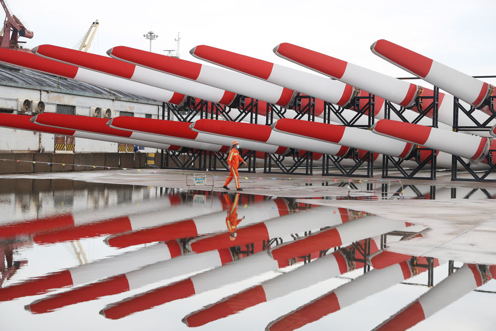 7月15日在江苏连云港港东方公司码头拍摄待装船的风电设备。新华社发(王春摄)