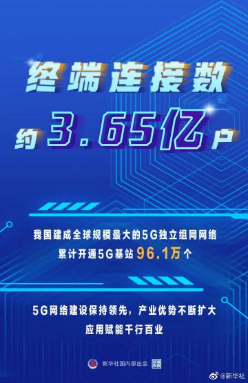 【#权威快报#|#5G终端连接数约3.65亿户#】记者从16日国新办召开的发布会上了解到,我国已建成全球规模最大的5G独立组网网络,累计开通5G基站96.1万个,5G终端连接数约3.65亿户。5G网络建设保持领先、产业优势不断扩大、应用赋能千行百业。(记者张辛欣,海报设计贾伊宁)