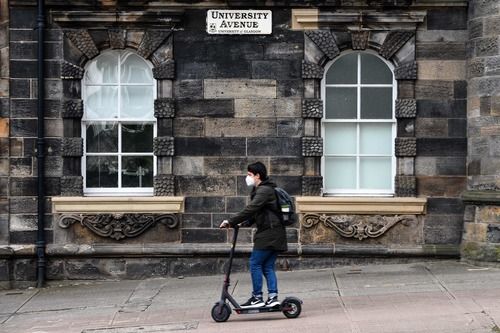 2020年9月24日,在位于英国苏格兰的格拉斯哥大学,一名学生经过校园建筑。新华社/法新