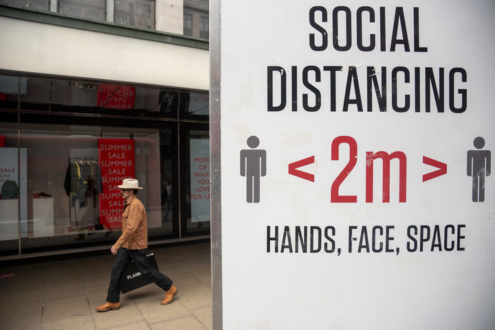 7月12日,在英国伦敦,一名男子从提示人们保持社交距离的牌子旁走过。新华社发(雷伊·唐摄)