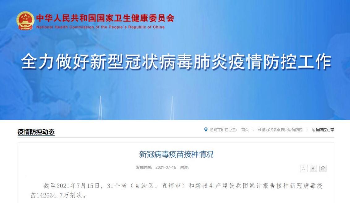 据国家卫健委消息,截至2021年7月15日,31个省(自治区、直辖市)和新疆生产建设兵团累计报告接种新冠病毒疫苗142634.7万剂次。