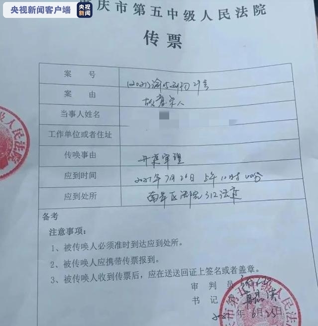 据重庆市第五中级人民法院传票显示,本案将在7月26日开庭审理。