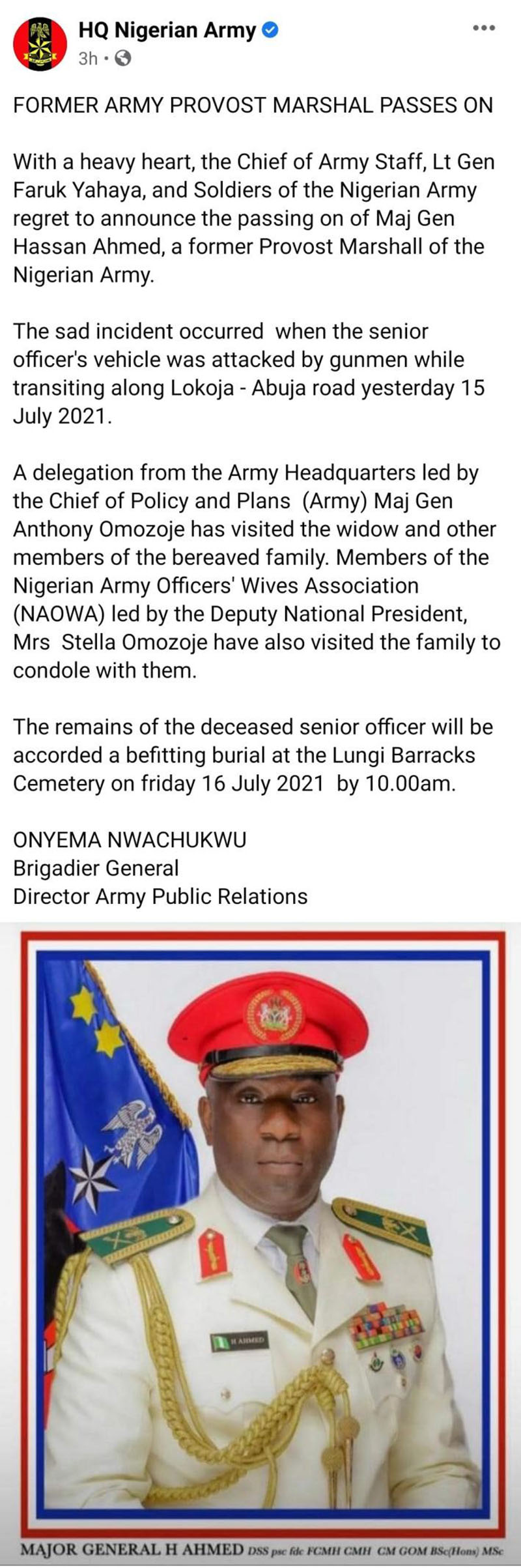 尼日利亚陆军公共关系负责人16日通过社交媒体宣布,尼陆军总部一名部门主管、前陆军军纪负责人哈桑·艾哈迈德少将,15日晚在由科吉州返回首都阿布贾的公路上遭遇枪手袭击身亡。当地媒体报道称,其妻子被绑架。