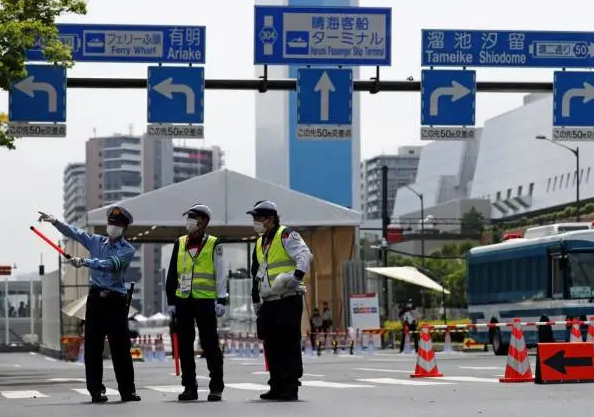 △7月13日,在日本东京,警察和安保人员在运动员村门口站岗(图片来源:路透社)