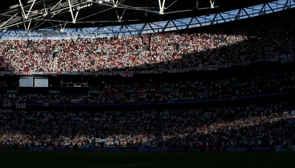 ↑7月7日,英格兰队球迷在看台上观看半决赛英格兰队与丹麦队的比赛。