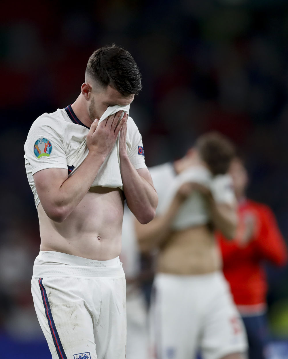 ↑7月11日,英格兰队球员赖斯在赛后向球迷致意时掩面擦拭泪水。