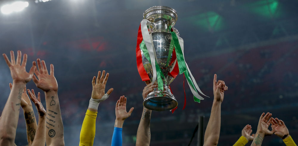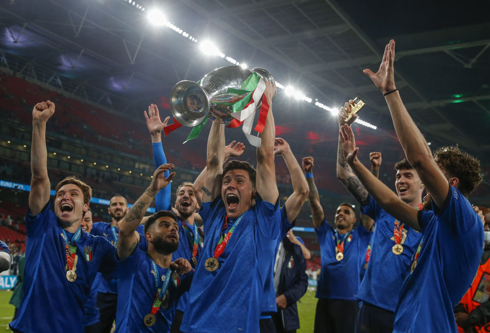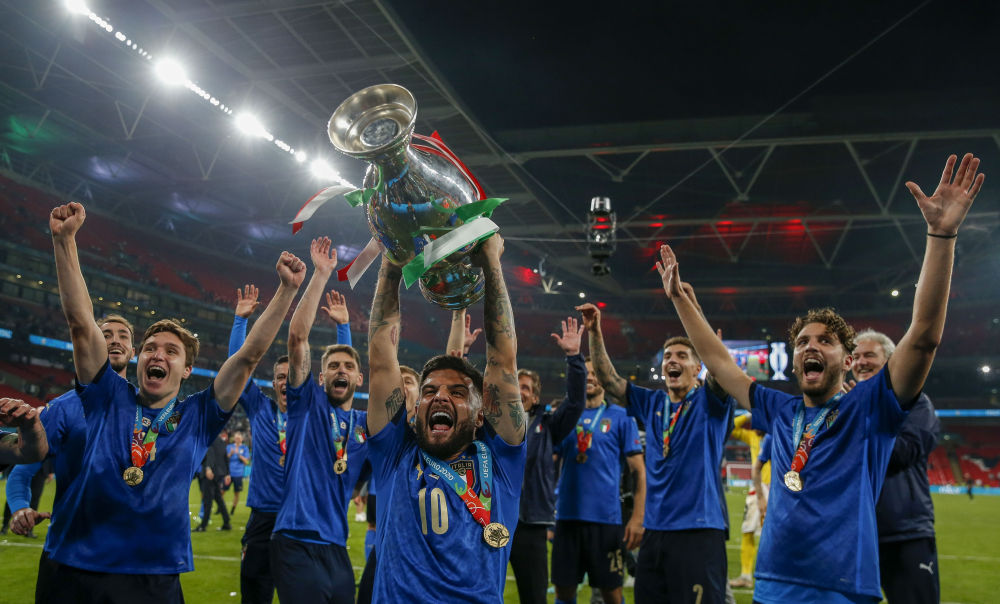 ↑7月11日,意大利队球员举起奖杯庆祝夺冠。