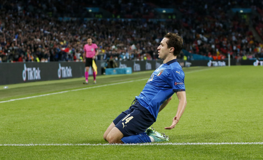 ↑7月6日,意大利队球员基耶萨在率先破门后庆祝。