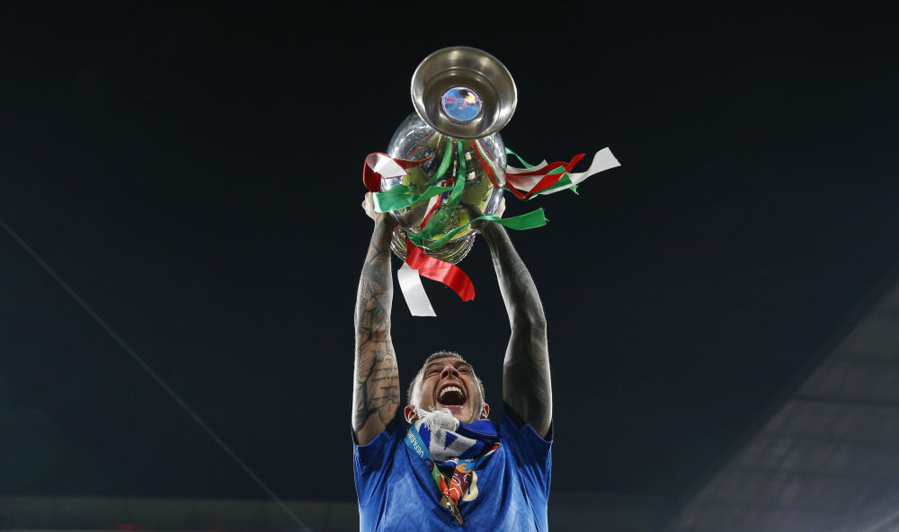 ↑7月11日,意大利队球员贝尔纳代斯基举起奖杯庆祝夺冠。