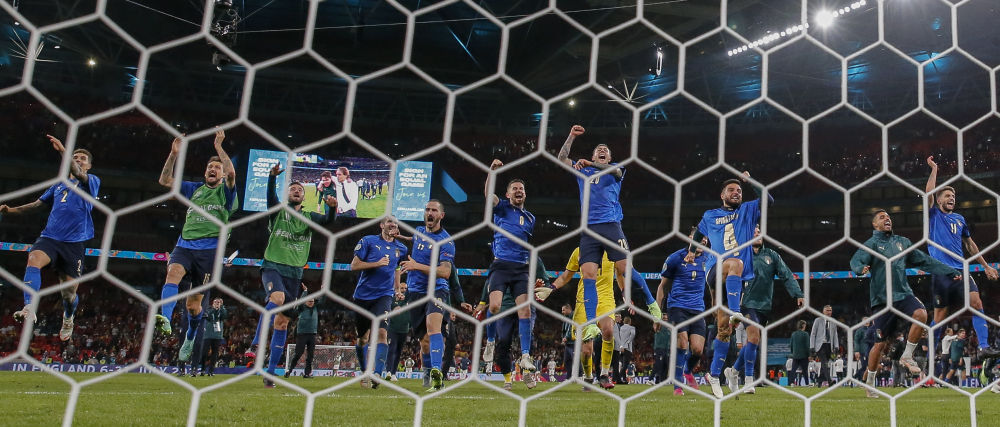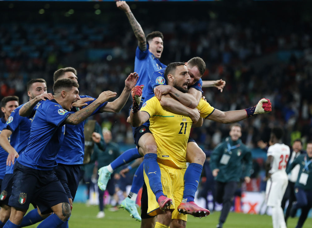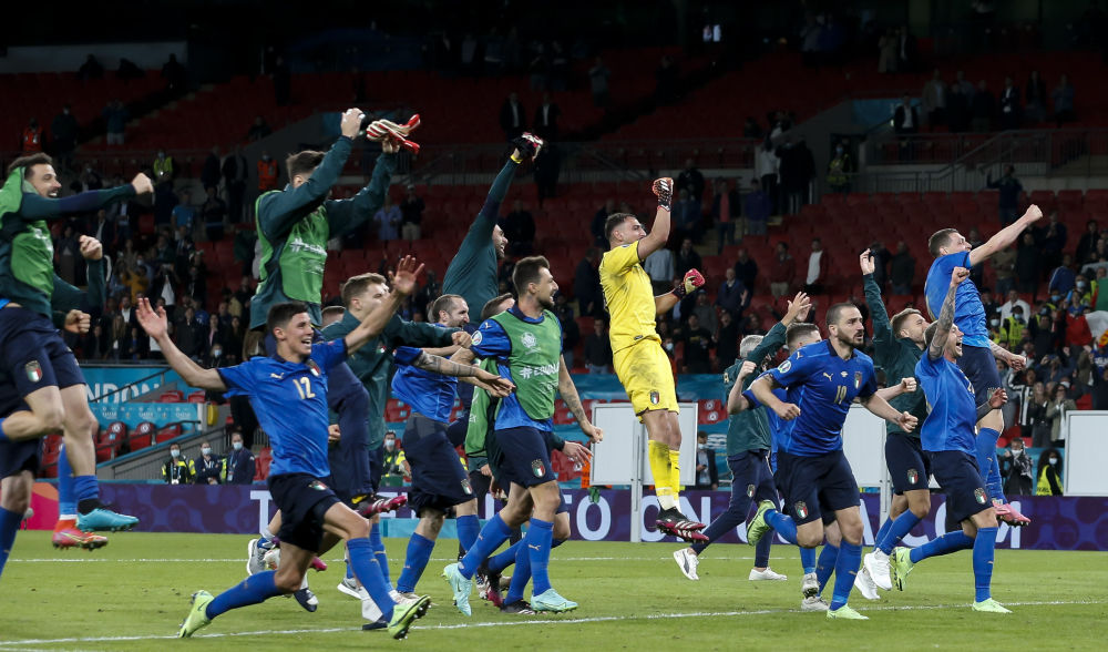 ↑7月11日,意大利队在赢得点球大战后与门将多纳鲁马(前右一)拥抱庆祝。