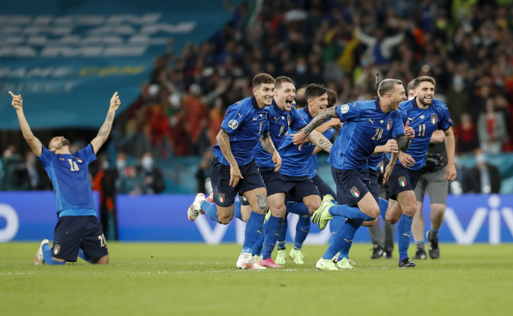 ↑7月11日,意大利队球员在赢得点球大战后拥抱庆祝。