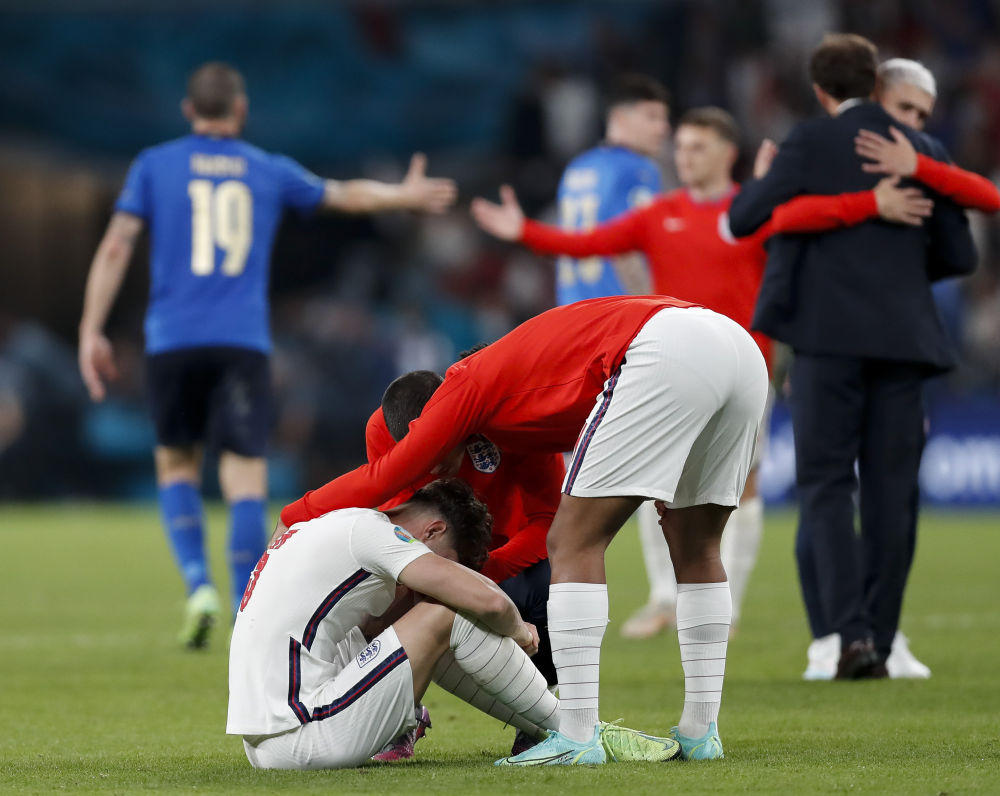 ↑7月11日,英格兰队球员在比赛失利后相互安慰。