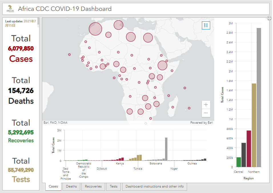 由于德尔塔毒株及其它变异新冠病毒在非洲大陆的快速传播,自5月中旬以来,非洲国家的新冠肺炎确诊病例数迅速攀升。非洲疾控中心数据显示,截至非洲东部时间7月15日,非洲地区共检测了55749290份样本,累计新冠肺炎确诊病例数已超600万,达6079850例。仅1个月的时间,非洲累计新冠肺炎确诊病例就从500万例增至600万例,而之前从400万例增至500万例历时约3个月时间。所以最近1个月来,非洲新冠肺炎确诊病例数的增长非常迅速。此外,非洲累计新冠肺炎死亡病例增至154726例,累计新冠肺炎治愈病例增至5292695例。非洲大陆累计新冠肺炎确诊病例数靠前的国家依次为南非、摩洛哥、突尼斯、埃及和埃塞俄比亚,而其中居于首位的南非的累计新冠肺炎确诊人数已超过了220万。有专家认为,由于非洲国家的新冠病毒检测能力有限,统计数据并不能反映非洲第三波新冠疫情的全部,实际情况可能更为严峻。