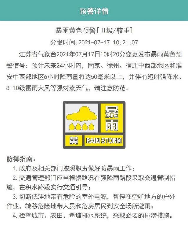 江苏省气象台今天(17日)10时20分变更发布暴雨黄色预警信号:预计未来24小时内,南京、徐州、宿迁中西部地区和淮安中西部地区6小时降雨量将达50毫米以上,并伴有短时强降水、8~10级雷雨大风等强对流天气,请注意防范。